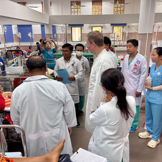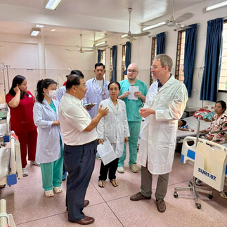 Prof. Möhrlen ist seit 2021 Direktor der Chirurgie am Kispi, Spezialist für Viszerale-, Thorax-, Fetalchirurgie, Co-Direktor im Zentrum für fetale Diagnostik und Therapie sowie Professor an der Universität Zürich. Am Montag nach seiner Ankunft wurde auch er, wie ich an meinem ersten Tag hier, am grossen Morgenrapport vom ganzen Spitalpersonal begrüsst – gleich nach der Nationalhymne, die jeden Montagmorgen gesungen wird. Der Spezialist wurde eingeladen, um die einheimischen Chirurgen in der minimal-invasiven Chirurgie weiterzubringen. Eine kleine Delegation aus Phnom Penh ist ebenfalls angereist, um an diesen Fortbildungen teilzunehmen. Noch dazustossen wird Dr. Denis Laurent, der Direktor beider Spitäler.