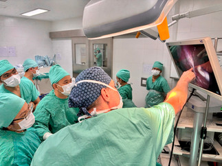 Es war Zeit für die erste Operation. Der Saal war voll, und dieses Bild begleitete uns durch die ganze medizinische Mission hindurch. Zum Teil waren es bis zu zehn Ärzte, die sich um den Gast herum bemühten, einen guten Blick auf die Operation und die Bildschirme zu erhalten. Zusätzlich kamen noch das unterstützende Team wie Anästhesie- und OP-Pflege und ich dazu, und dann war der Saal mit bis zu zwanzig Personen gefüllt. Ein lustiger Anblick. Mich erinnerten die Bilder ein bisschen an die «Wo ist Walter?»-Bücher oder ein Renaissance-Gemälde. Das wäre so in der Schweiz nicht möglich, meinte der Professor zu mir.